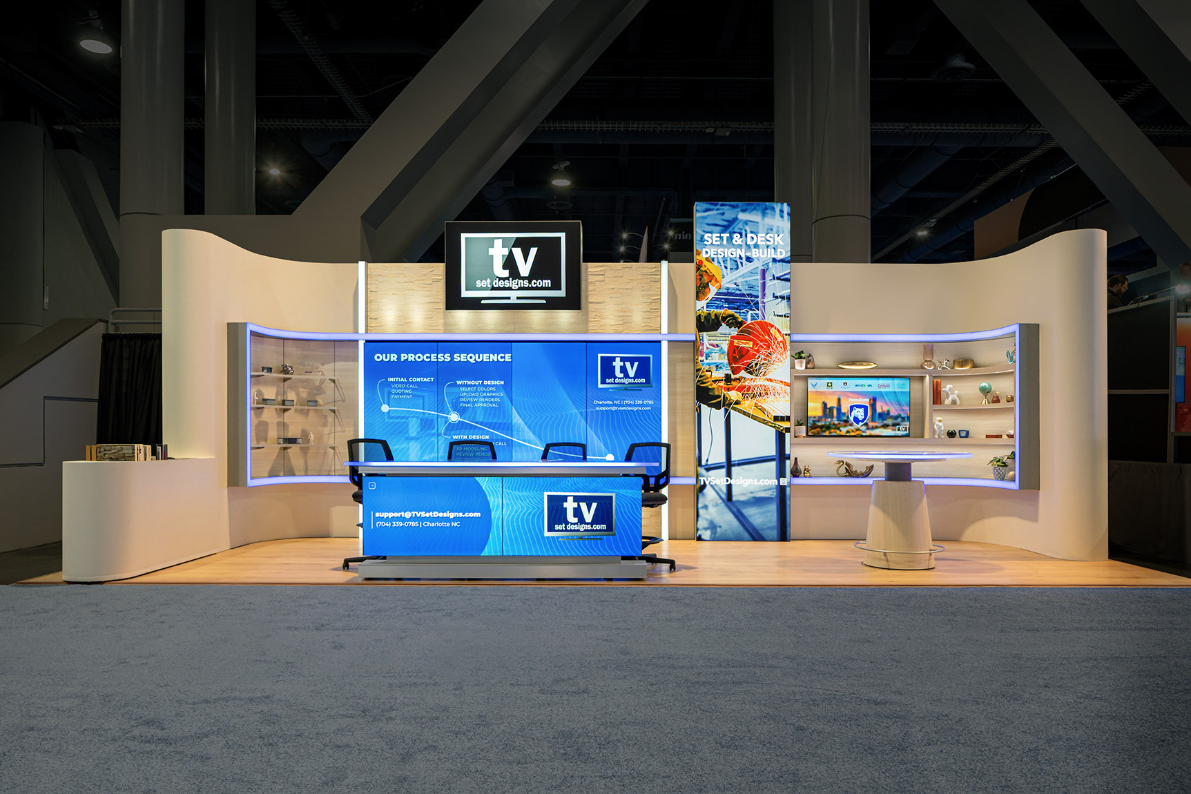 I led the design and project management of TVSetDesigns.com’s trade show booths at the NAB Show, the world’s largest broadcast trade show, in 2024 and 2025. Each 10’ x 30’ perimeter booth, with elements up to 12’ high, was designed to attract attention, showcase our desk products, and push the boundaries of our Modular Set Frame System by integrating new, repeatable elements. Beyond design, I applied my marketing expertise to ensure the booths reflected current trends, client needs, and positioning for higher-end markets.
