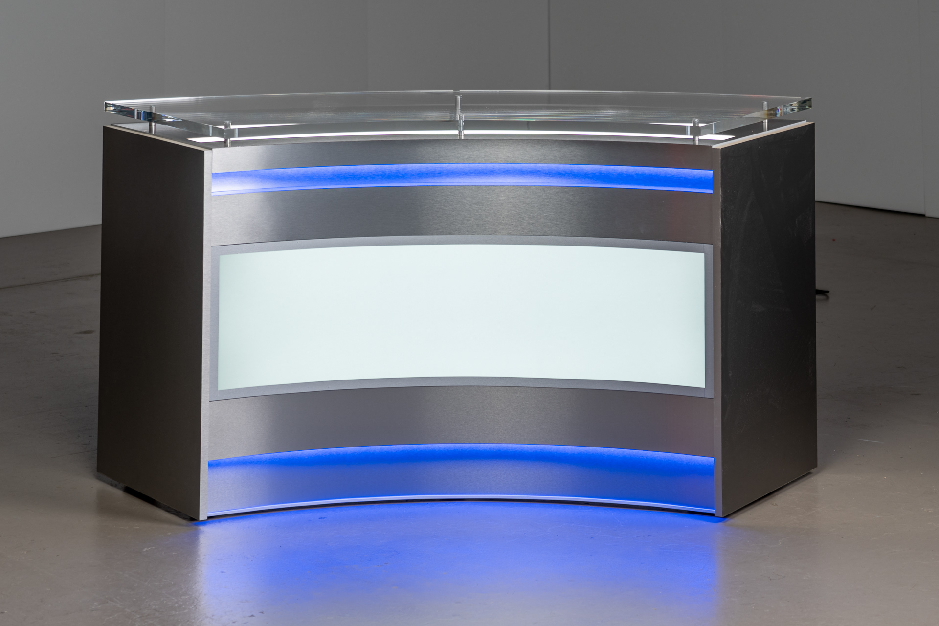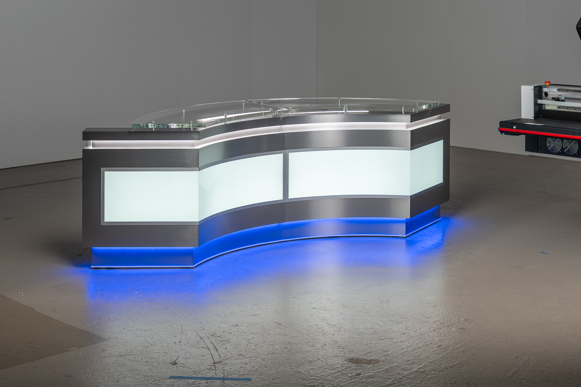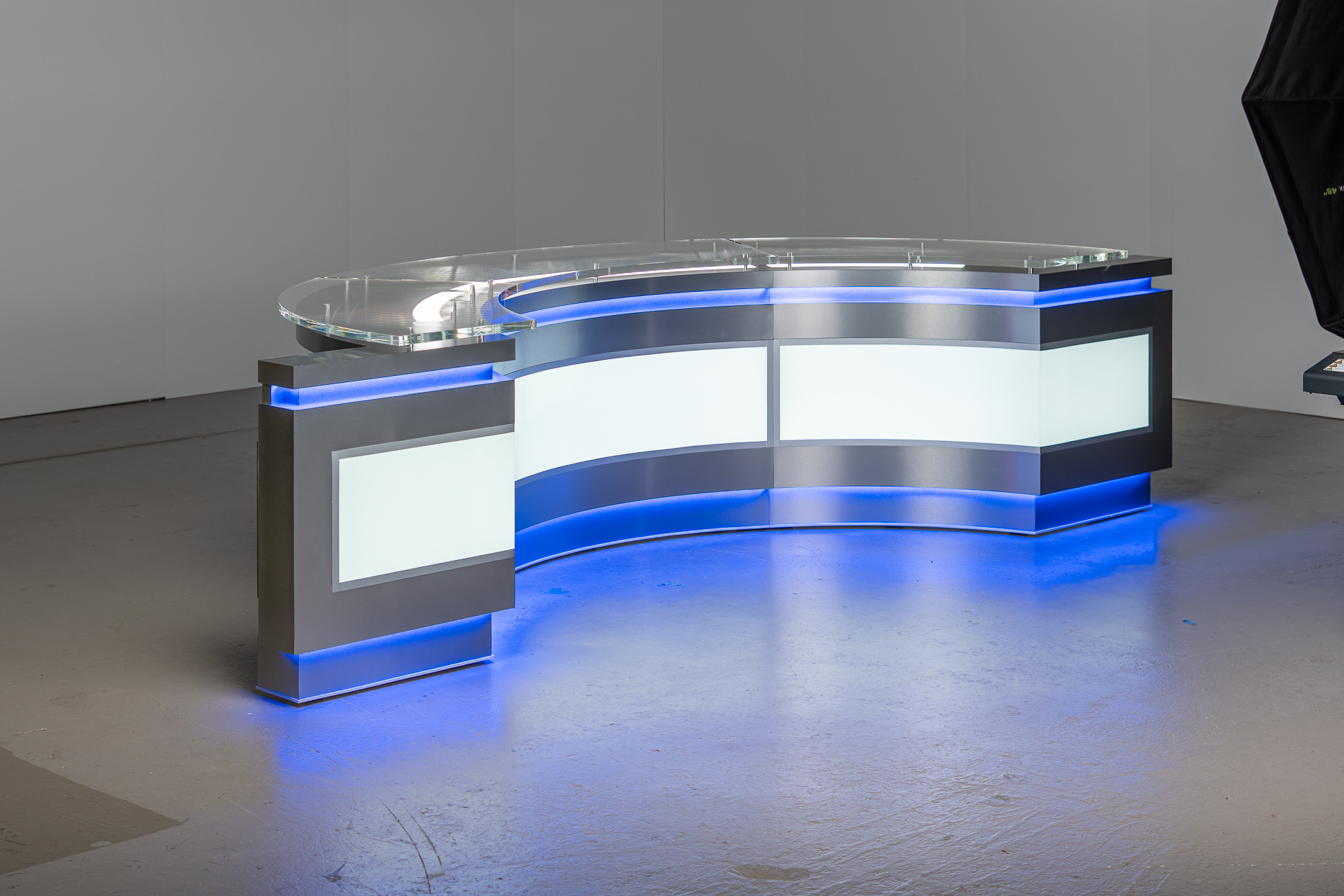I designed a custom, modular news desk for Freedom Project, an educational organization, creating a high-impact studio element within a compact 12-foot space. The desk needed to be repositionable, feature RGBW lighting, acrylic surfaces, and tunable chin lights, while maintaining a modern, minimalist, high-tech aesthetic inspired by the Good Morning America desk.