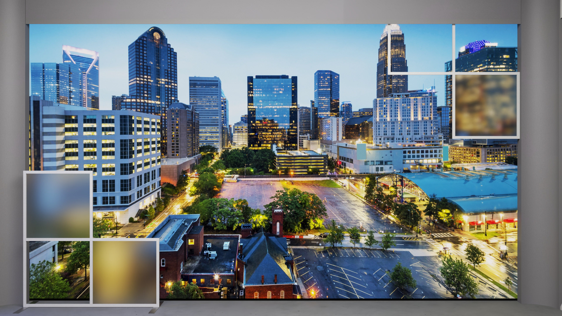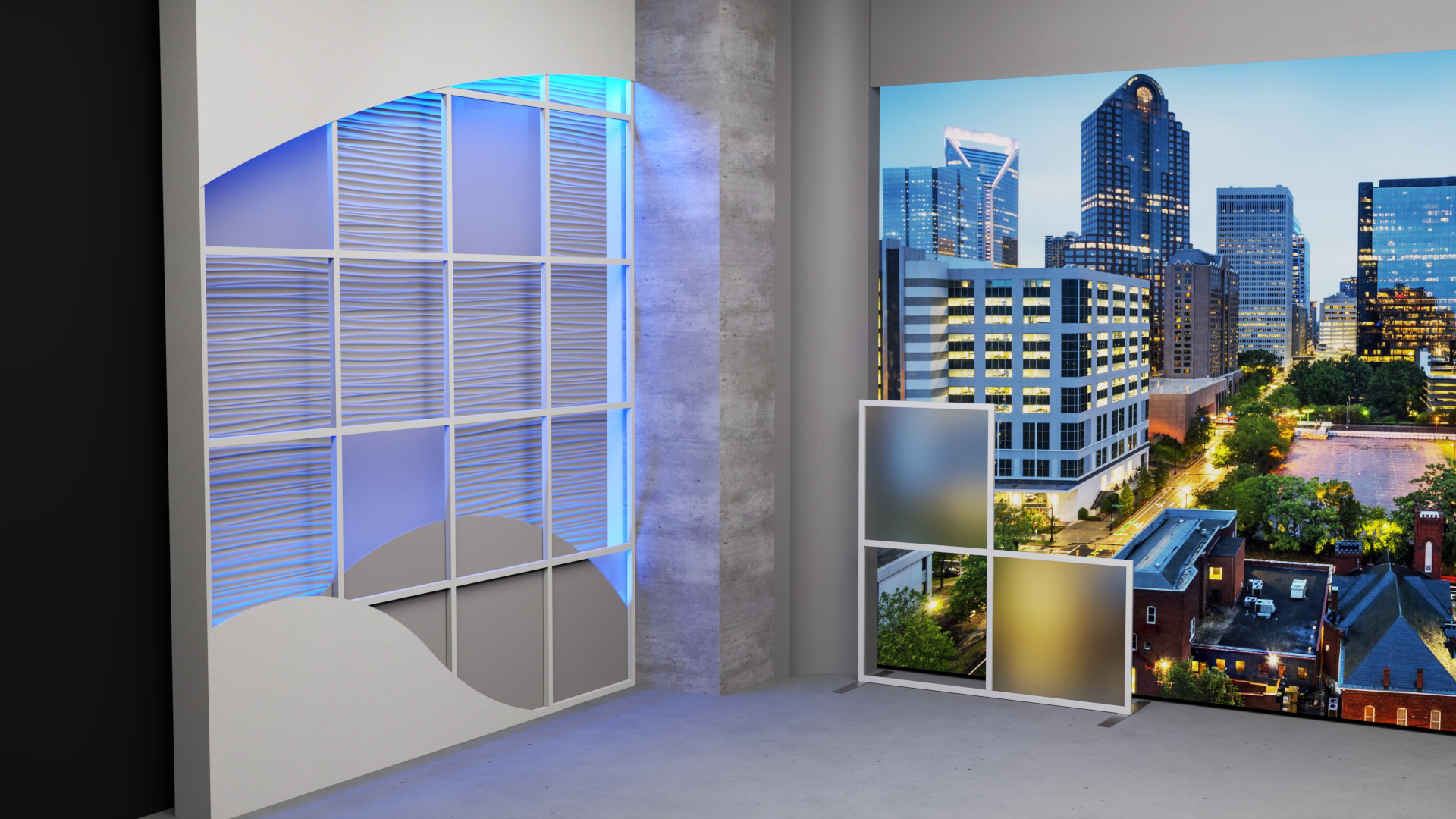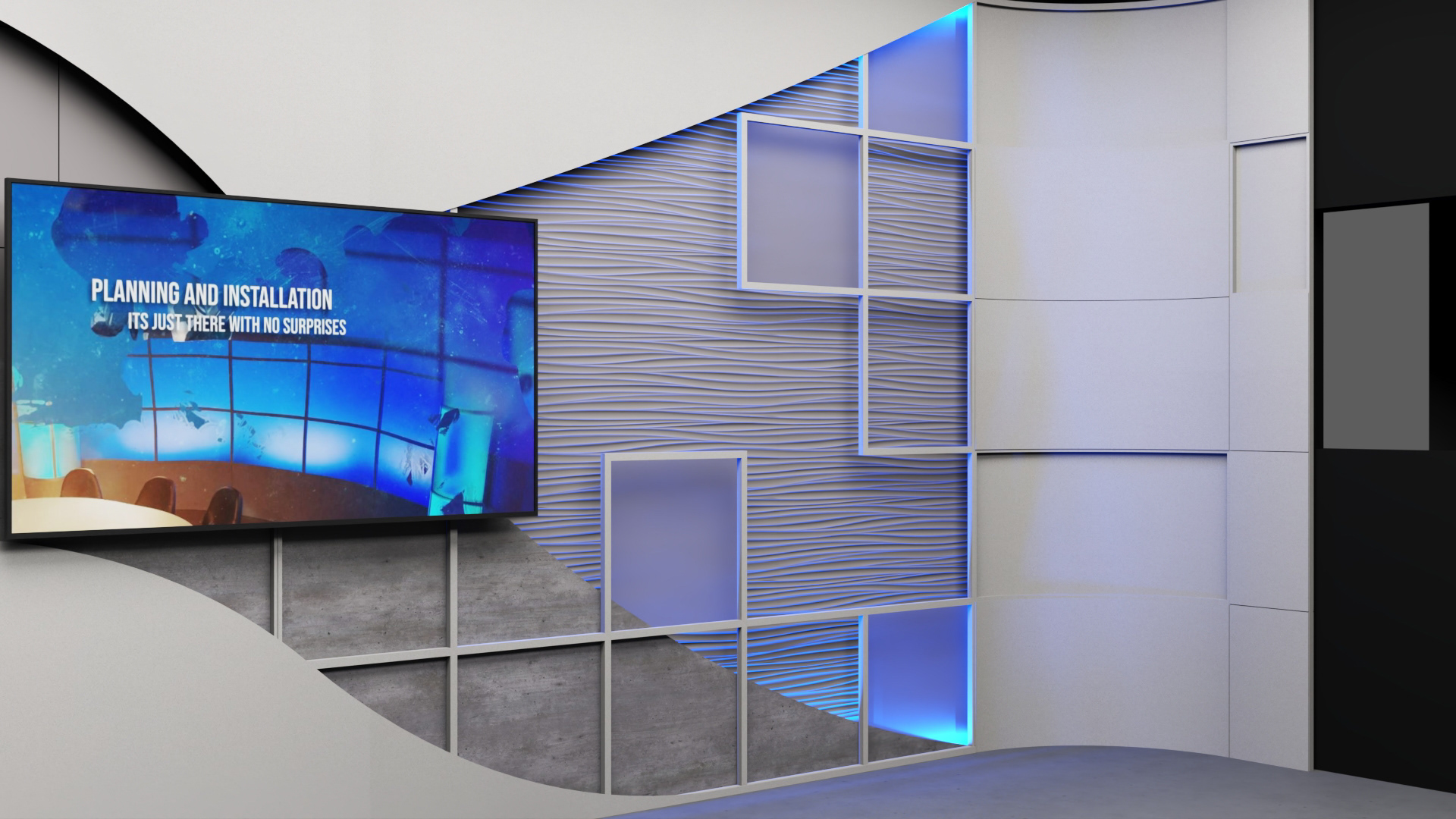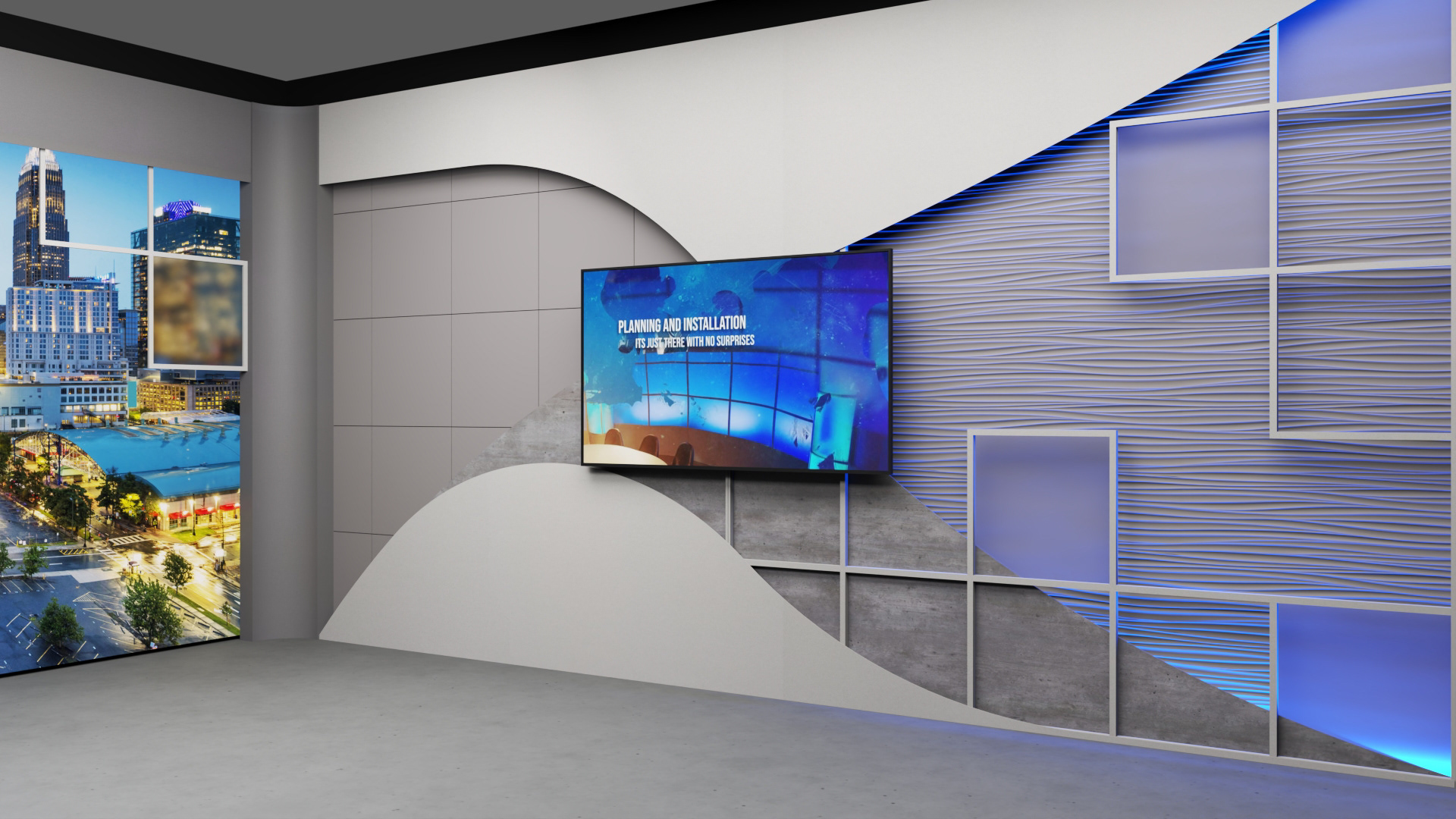 A large 16'W x 9'H dvLED video wall serves as the focal point for Wall 2, complemented by a commercial 76" display mounted on Wall 3. Movable design elements in front of the video wall extend the broken grid motif from Wall 3, visually tying the studio together and enhancing flexibility.