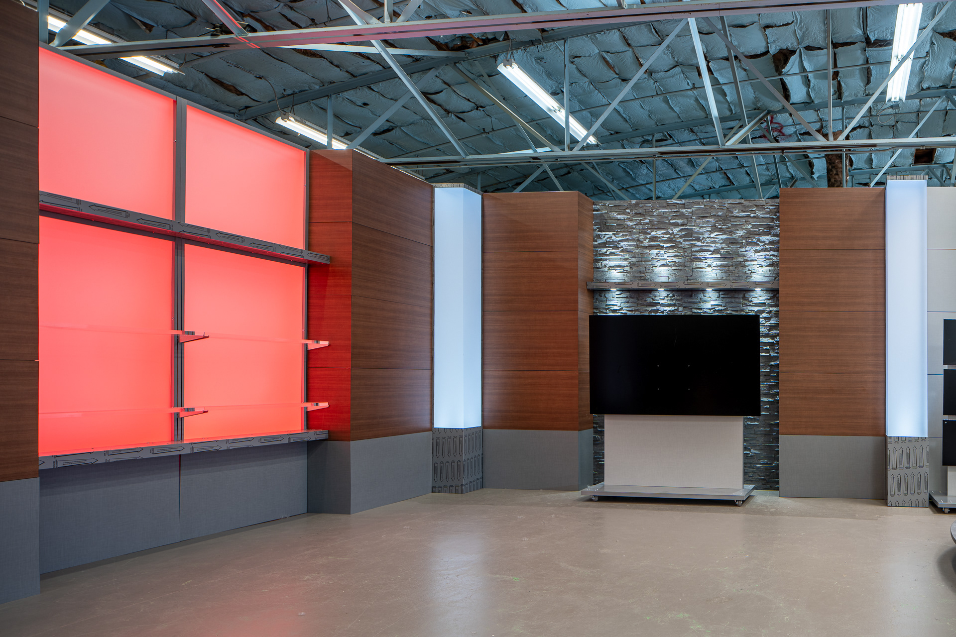Housed across two rooms—one approximately 30' x 40', the other 15' x 30'—the project included three distinct yet cohesive sets, each built around a modern, minimalistic aesthetic. The client’s top priorities were versatility, functionality, and a polished look both on camera and in person.